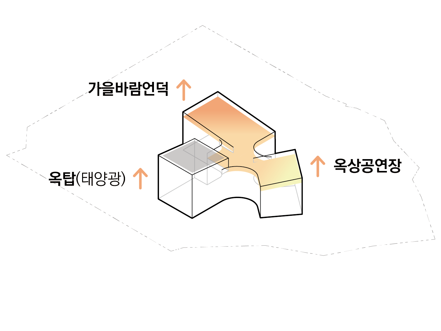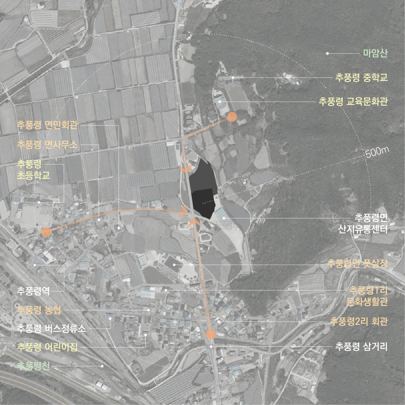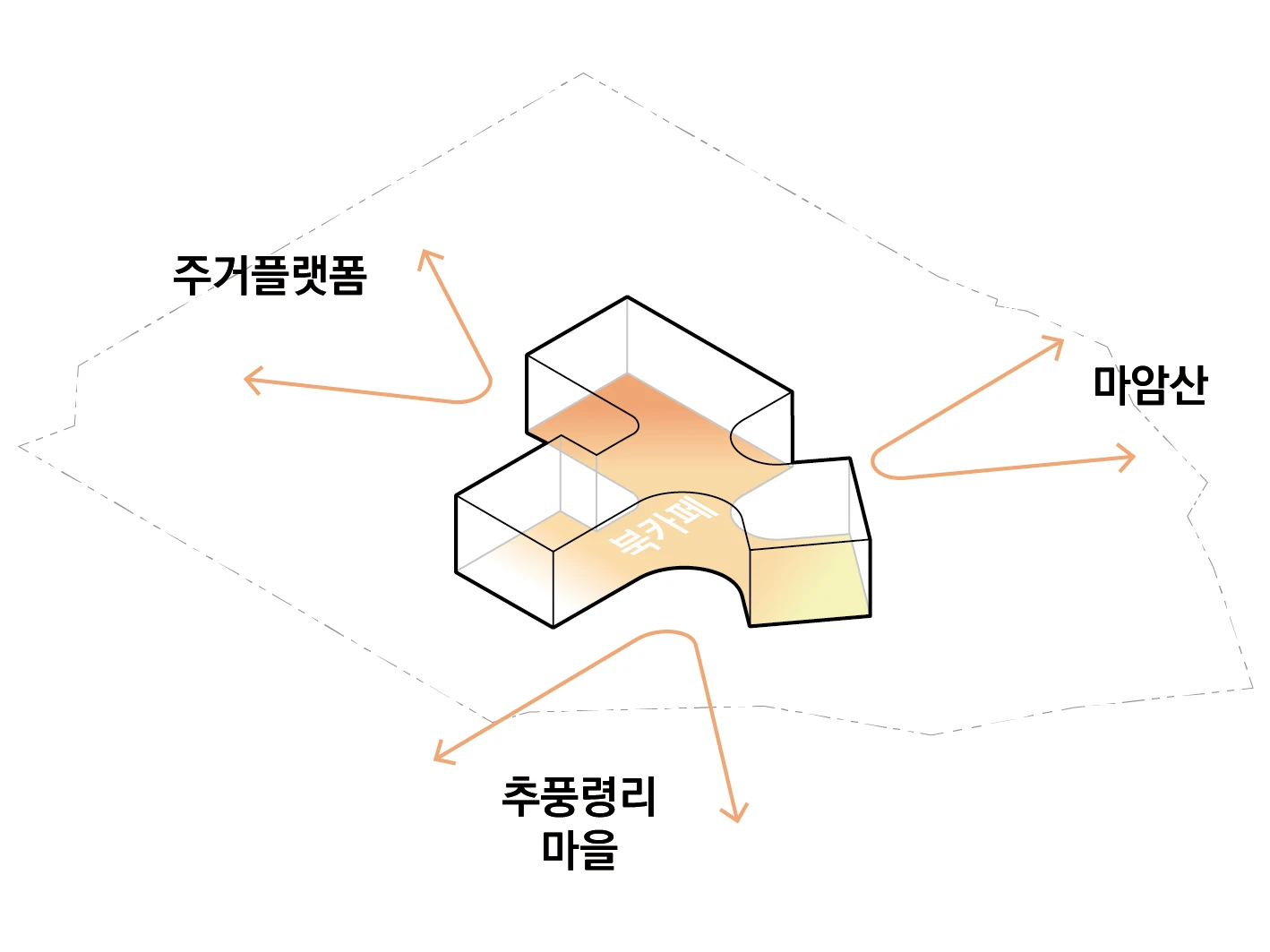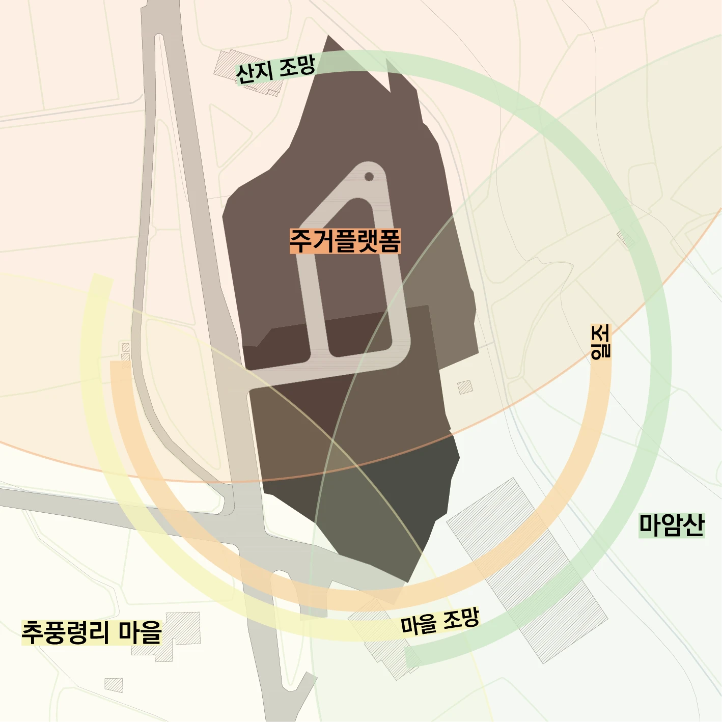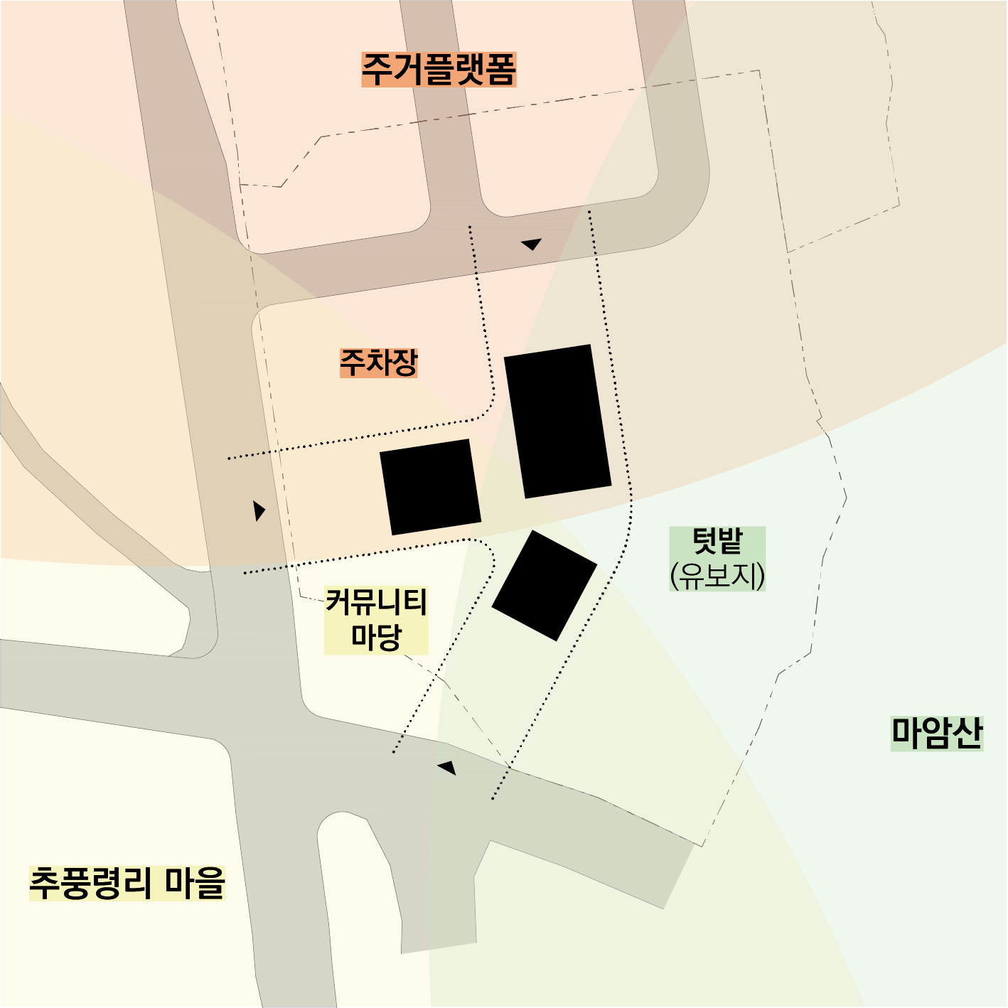기존의 추풍령리 마을과 마암산에 주거플랫폼이 추가되어, 대지는 다른 성격의 3개 영역이 교차하는 경계가 된다. 대지 남∙서측으로는 완만한 경사 아래로 추풍령리 마을을 조망할 수 있고, 동측으로 올려다 보면 마암산이 눈에 들어온다. 그리고 주거플랫폼에 들어설 주택의 위치와 일조∙프라이버시 등을 고려하여, 문화복합시설을 배치해야 한다.