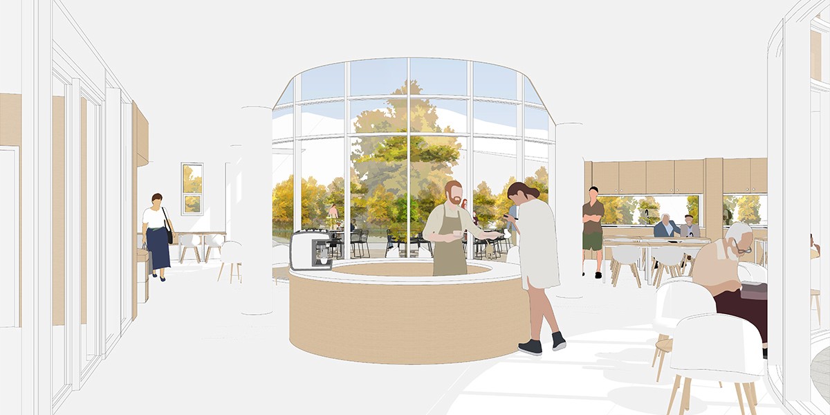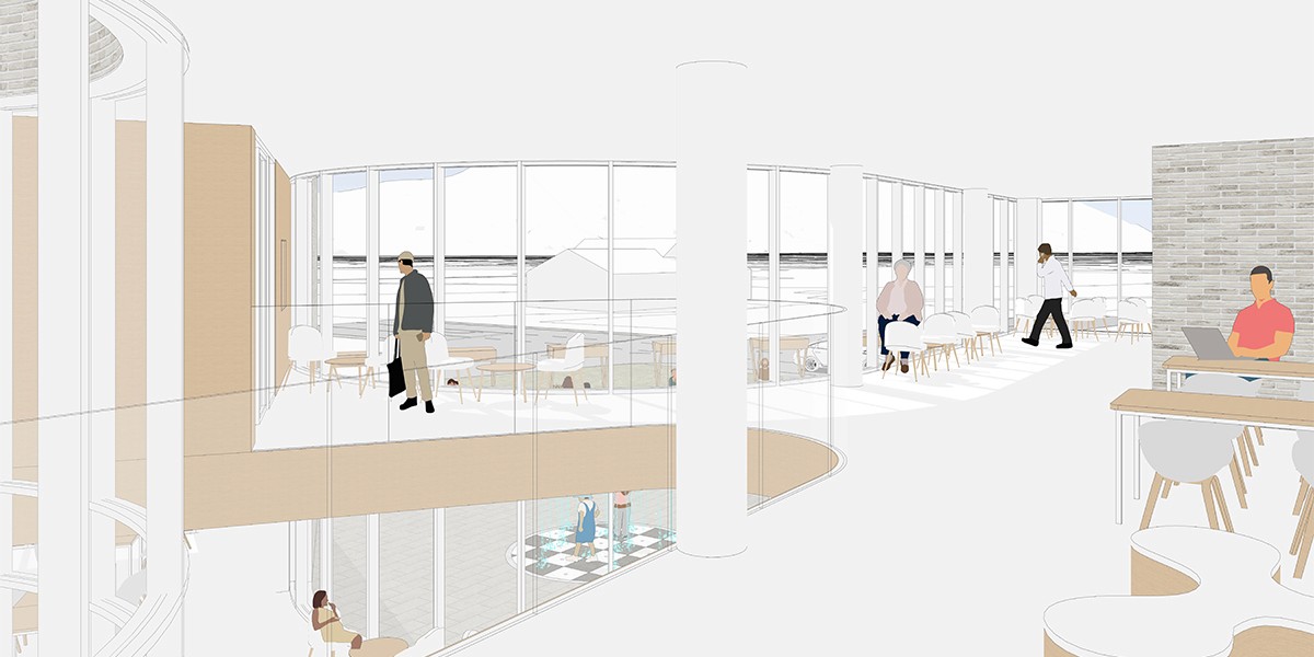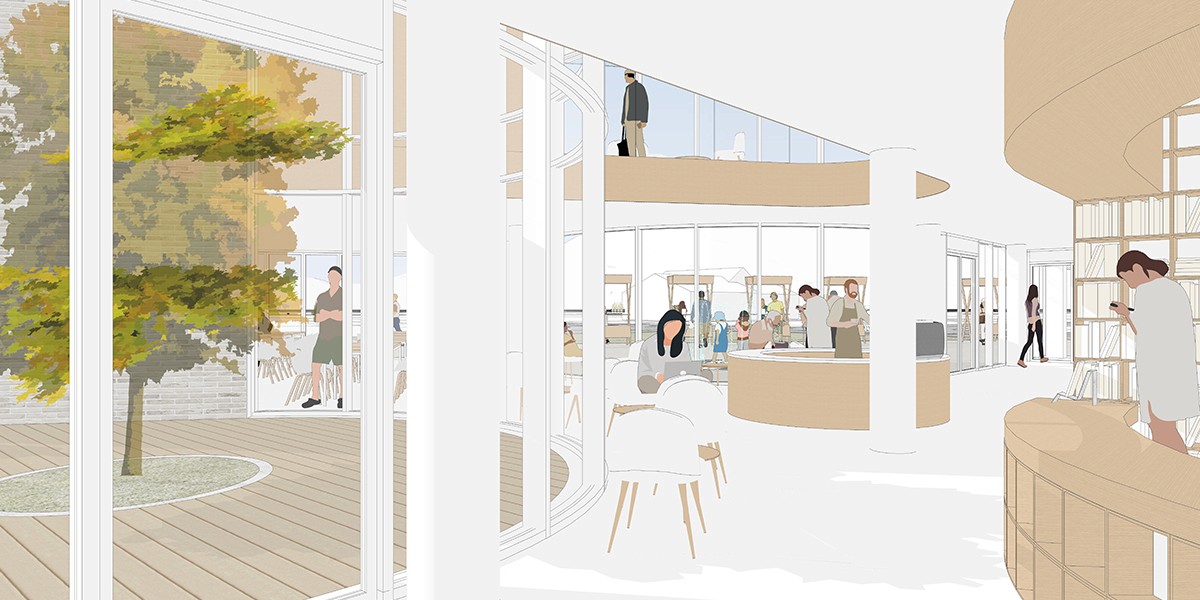 북카페는 1층 전체와 외부로 확장되고, 주거플랫폼 커뮤니티의 중심이 된다.