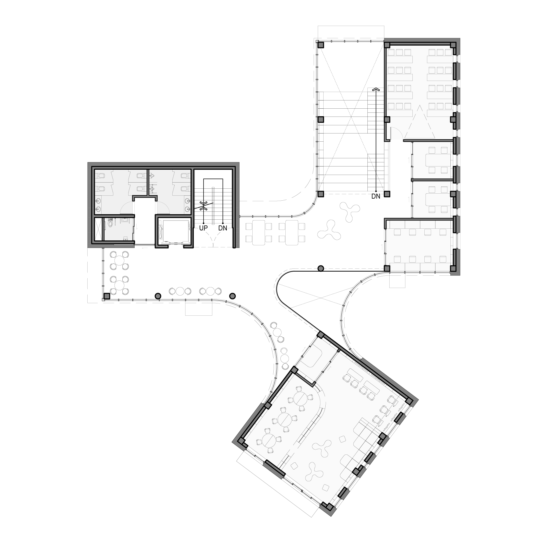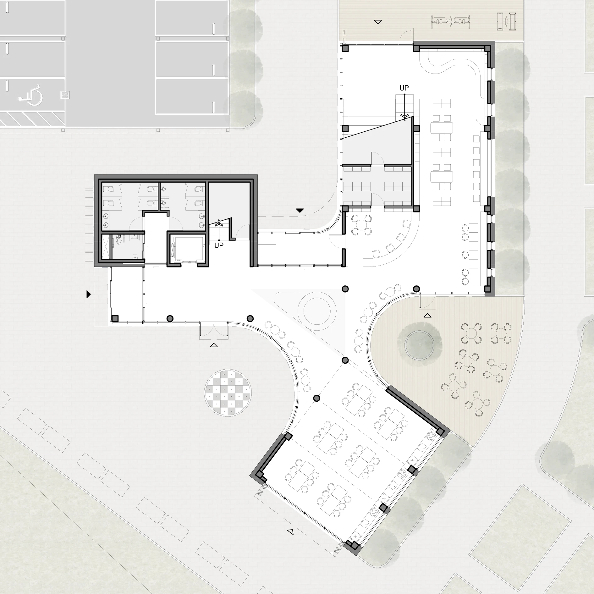 3개 매스를 연결하여, 하나의 공간으로 만든다. 매스에 나뉘어 있던 프로그램은 하나의 연속적인 바닥 위에 놓인다. 그 중심에 북카페를 배치하여 프로그램 간의 경계를 허물게 되면, 주민들은 북카페를 거쳐 자유롭게 이동할 수 있다. 내∙외부공간을 연계하여, 매스 사이의 틈에 위치한 크고 작은 마당도 북카페가 된다. 그리고 마당 너머 추풍령리 마을, 마암산, 주거플랫폼까지 시선을 확장한다.