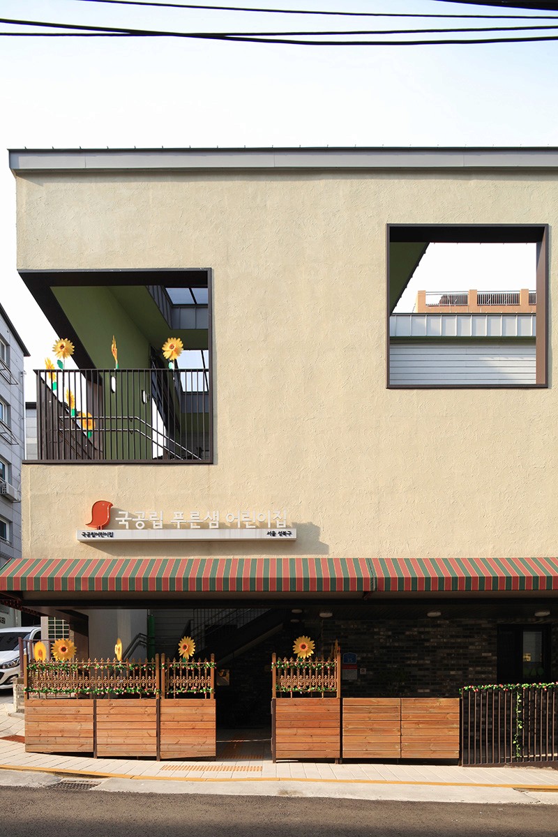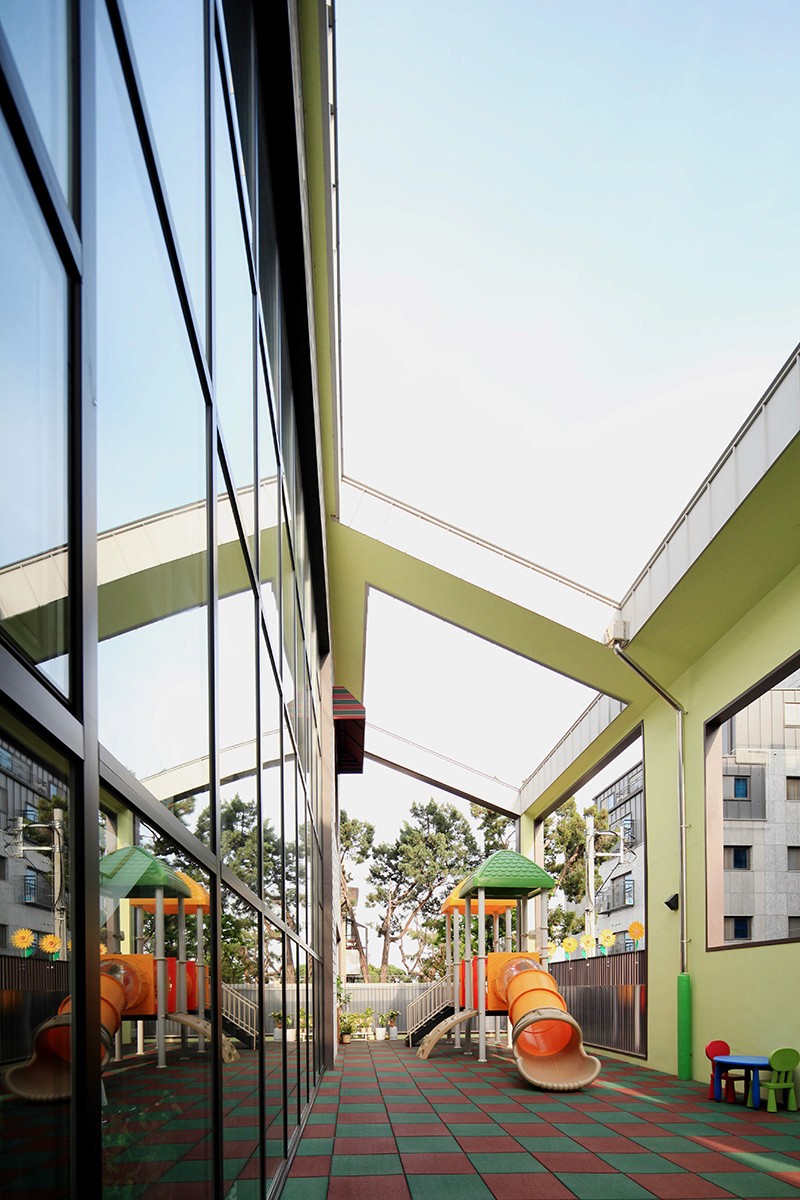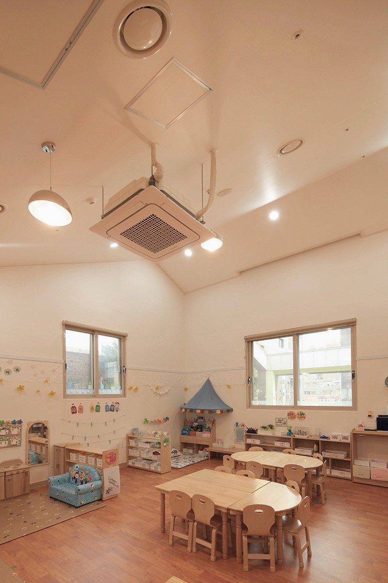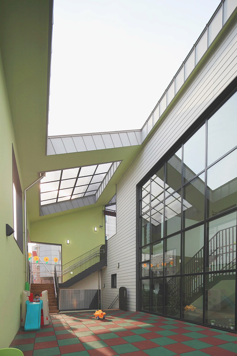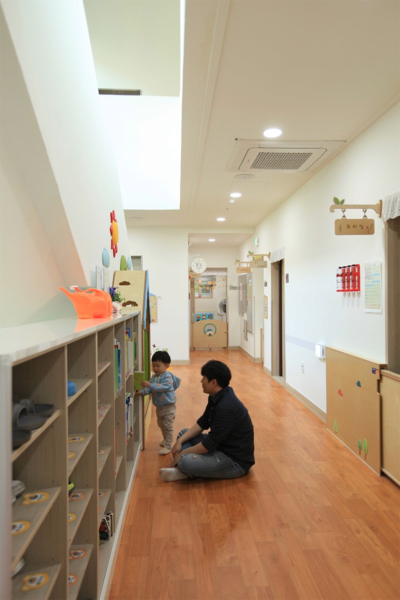 남측 도로에 면한 지하1층에는 보호자 대기공간과 장난감 도서관이 있어서, 어린이와 관련된 커뮤니티의 중심이 된다. 그리고 박공 형태의 외피에 채광과 조망을 고려한 창을 내어, 밝고 따뜻한 보육환경을 조성하고 주변으로 시선을 확장한다.
