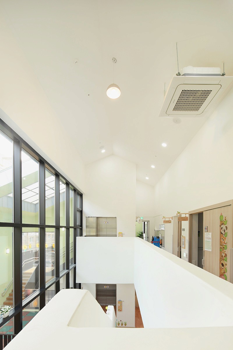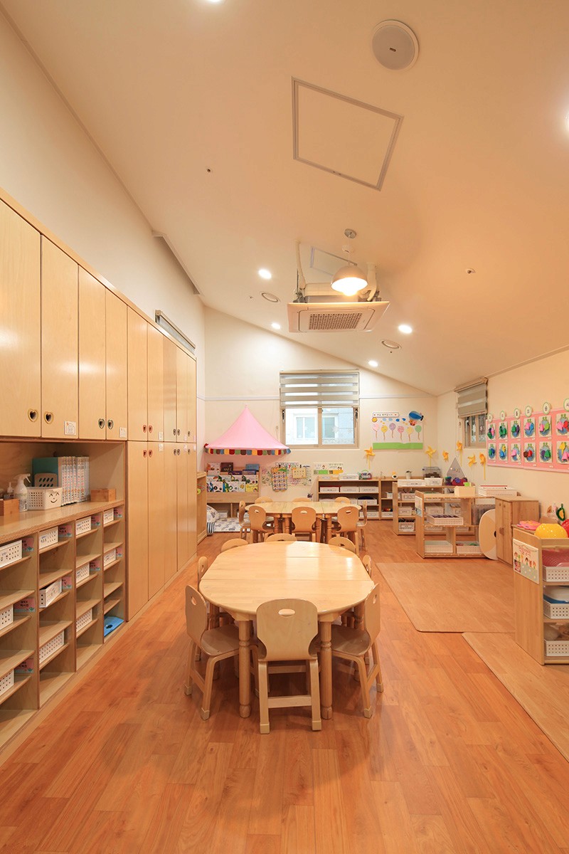 놀이터에서 들어오면 폭 2.1m의 유희실 있고, 계단을 통해 2층까지 확장되며, 각 보육실을 잇는다. 그리고 높은 창에서 쏟아지는 햇살로 가득한 유희실은 어린이들의 도서관이 된다.