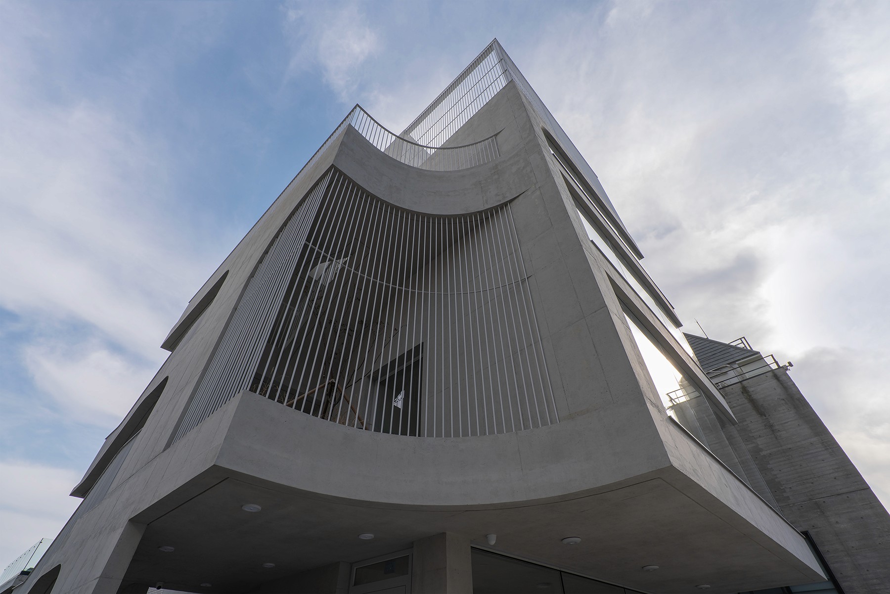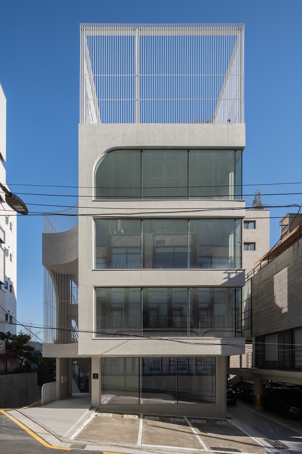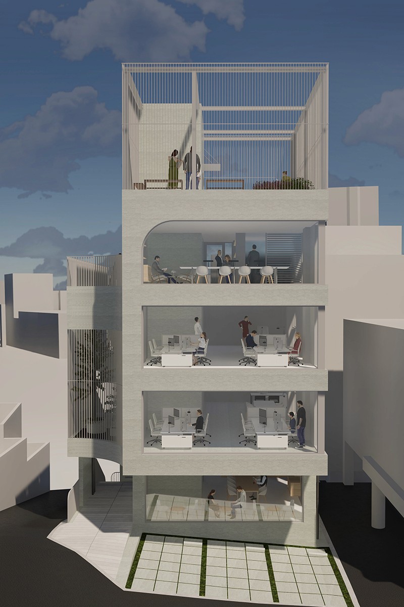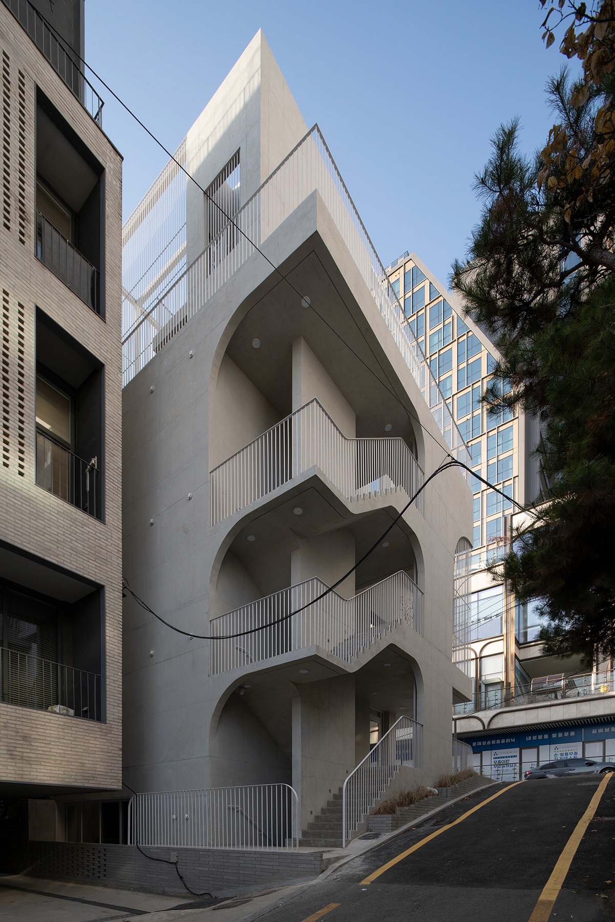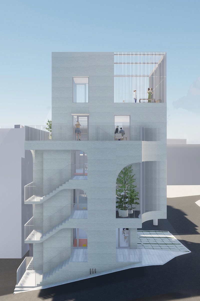 노출콘크리트로 도로 모퉁이의 곡면을 빚어내어, 건물의 얼굴을 만든다. 그리고 루버로 외부계단∙발코니∙옥상정원의 빈 곳을 메워, 형태를 완성한다.