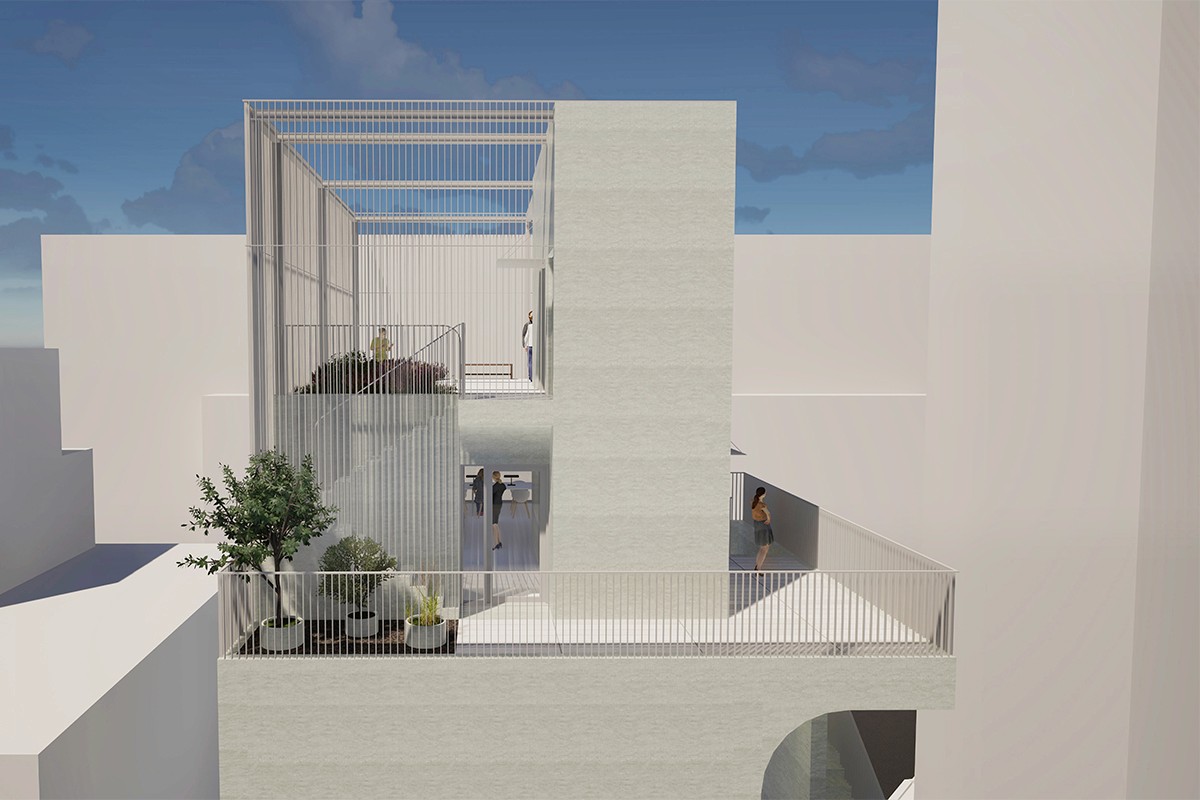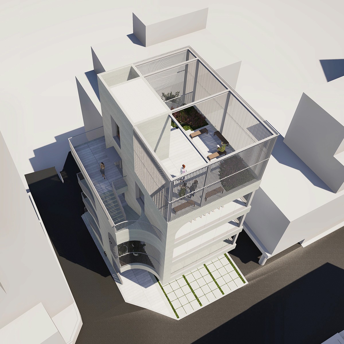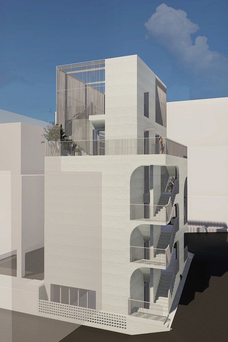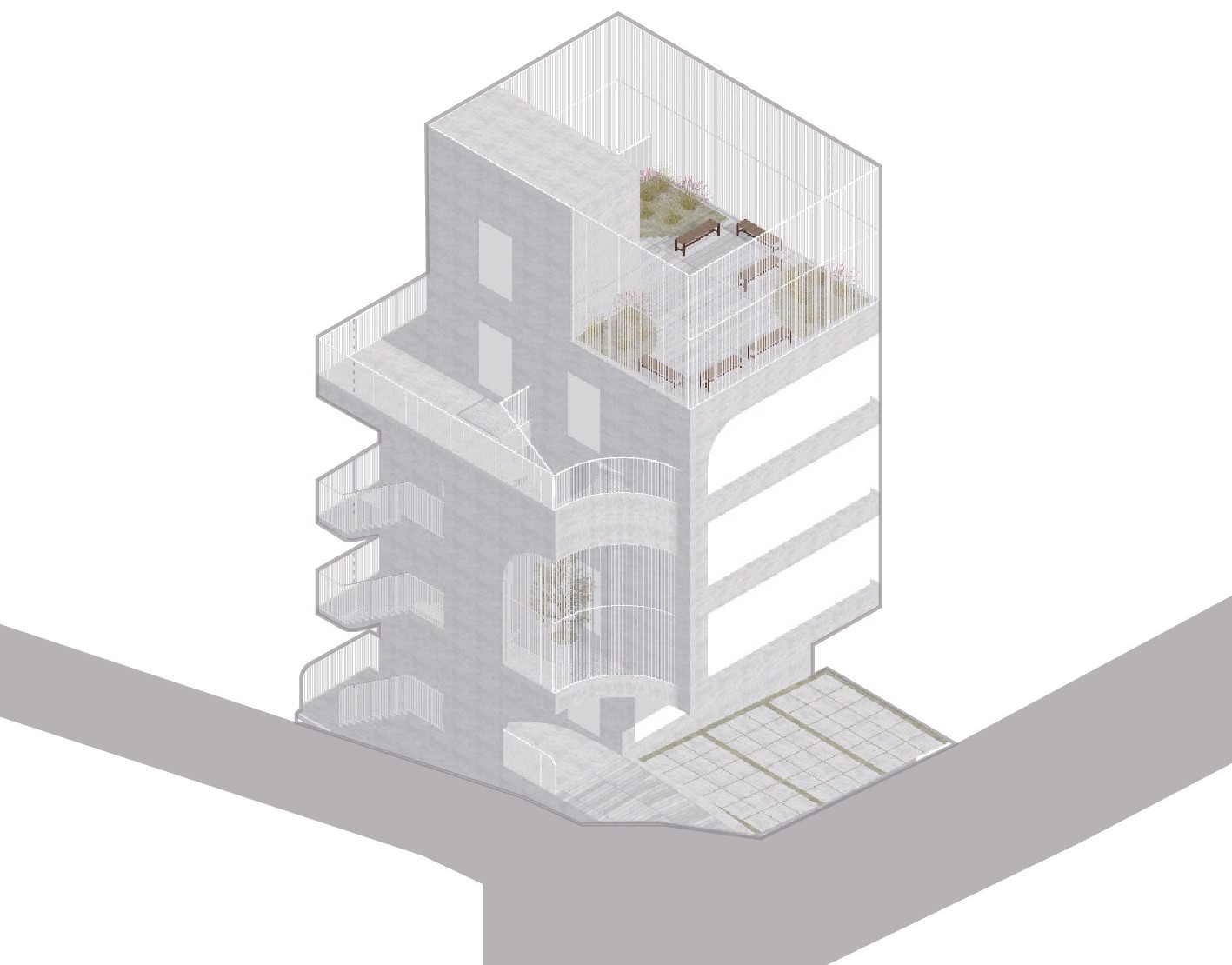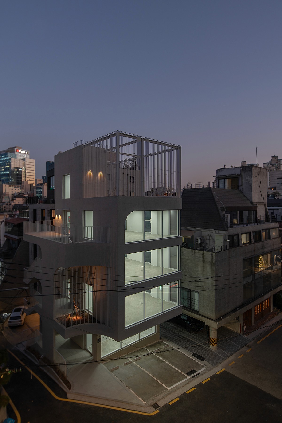 노출콘크리트로 도로 모퉁이의 곡면을 빚어내어, 건물의 얼굴을 만든다. 그리고 루버로 외부계단∙발코니∙옥상정원의 빈 곳을 메워, 형태를 완성한다.