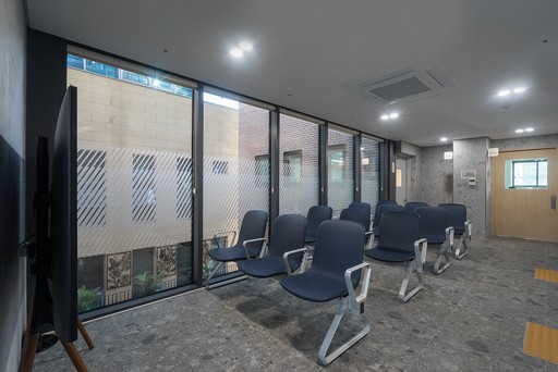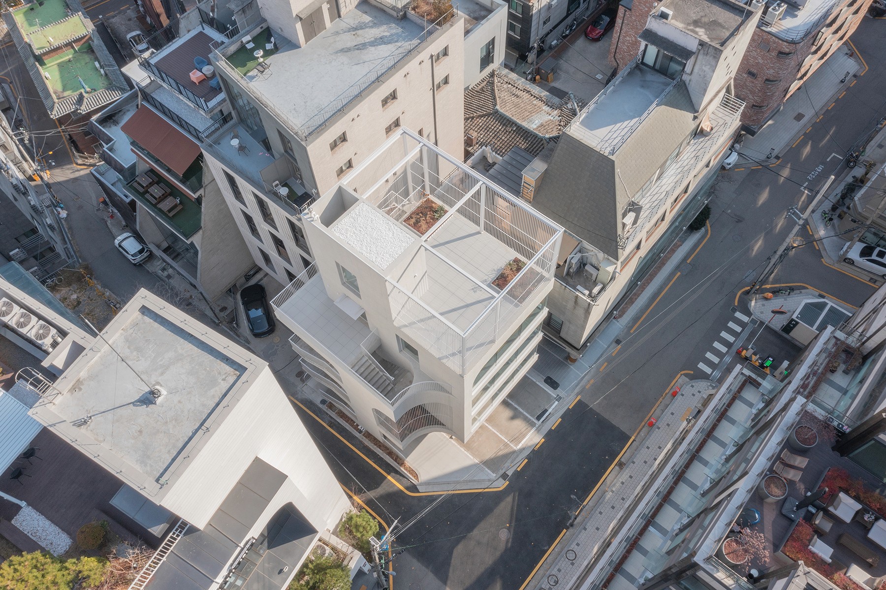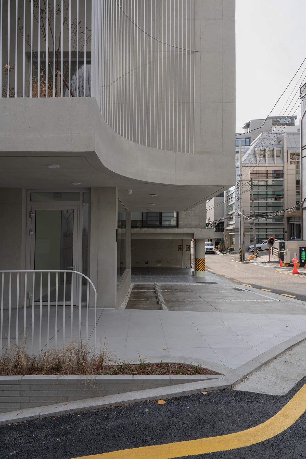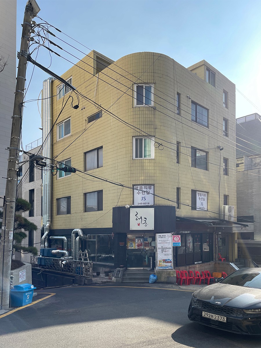 기존 건물은 이미 용적률이 법정 상한을 초과하여 증축할 수가 없다. 그리고 출입할 때 계단을 이용해야 하고, 주차구획이 없어서 접근성이 떨어진다. 하지만, 도로 모퉁이의 곡면은 건물에 대한 인지성을 높여준다.