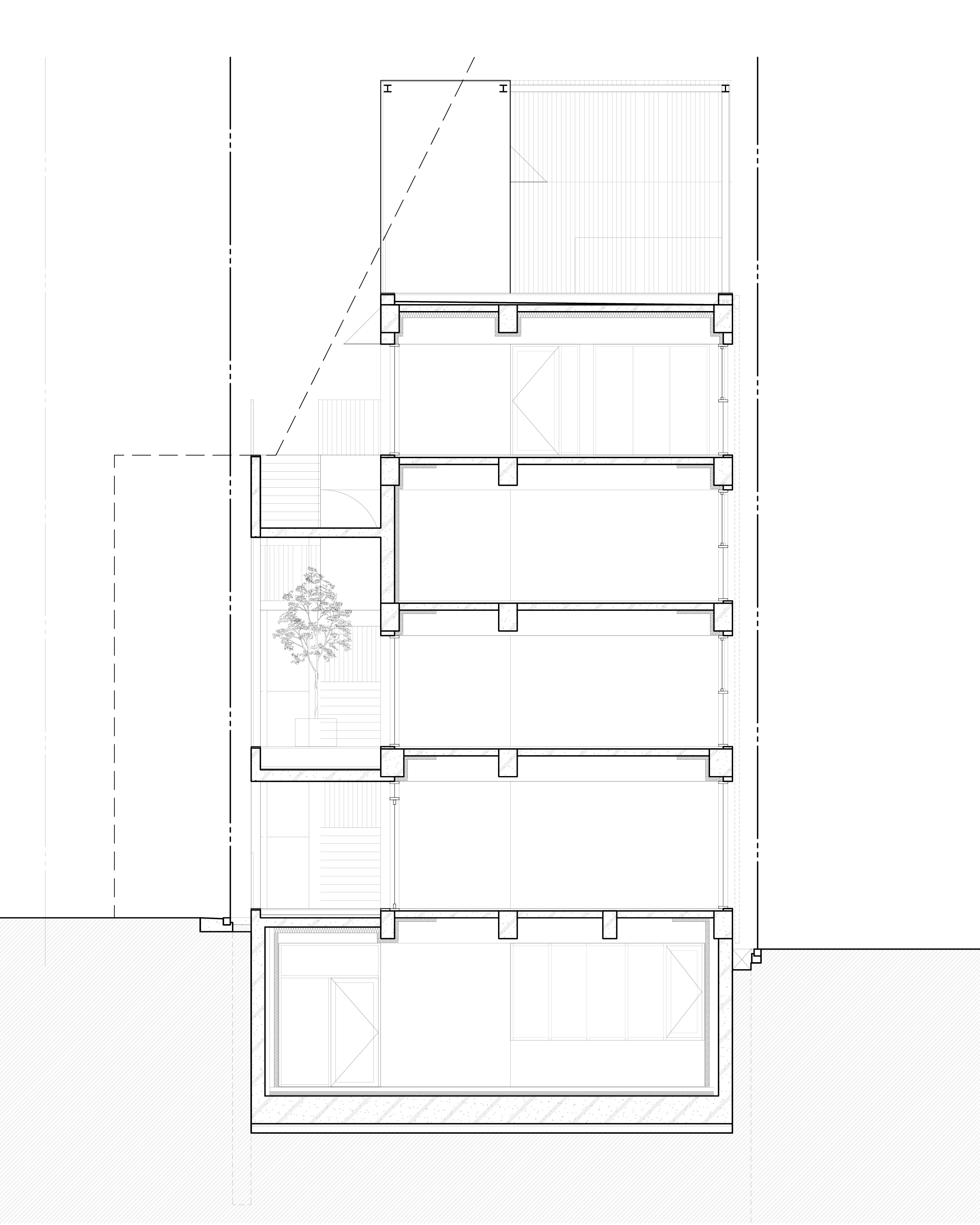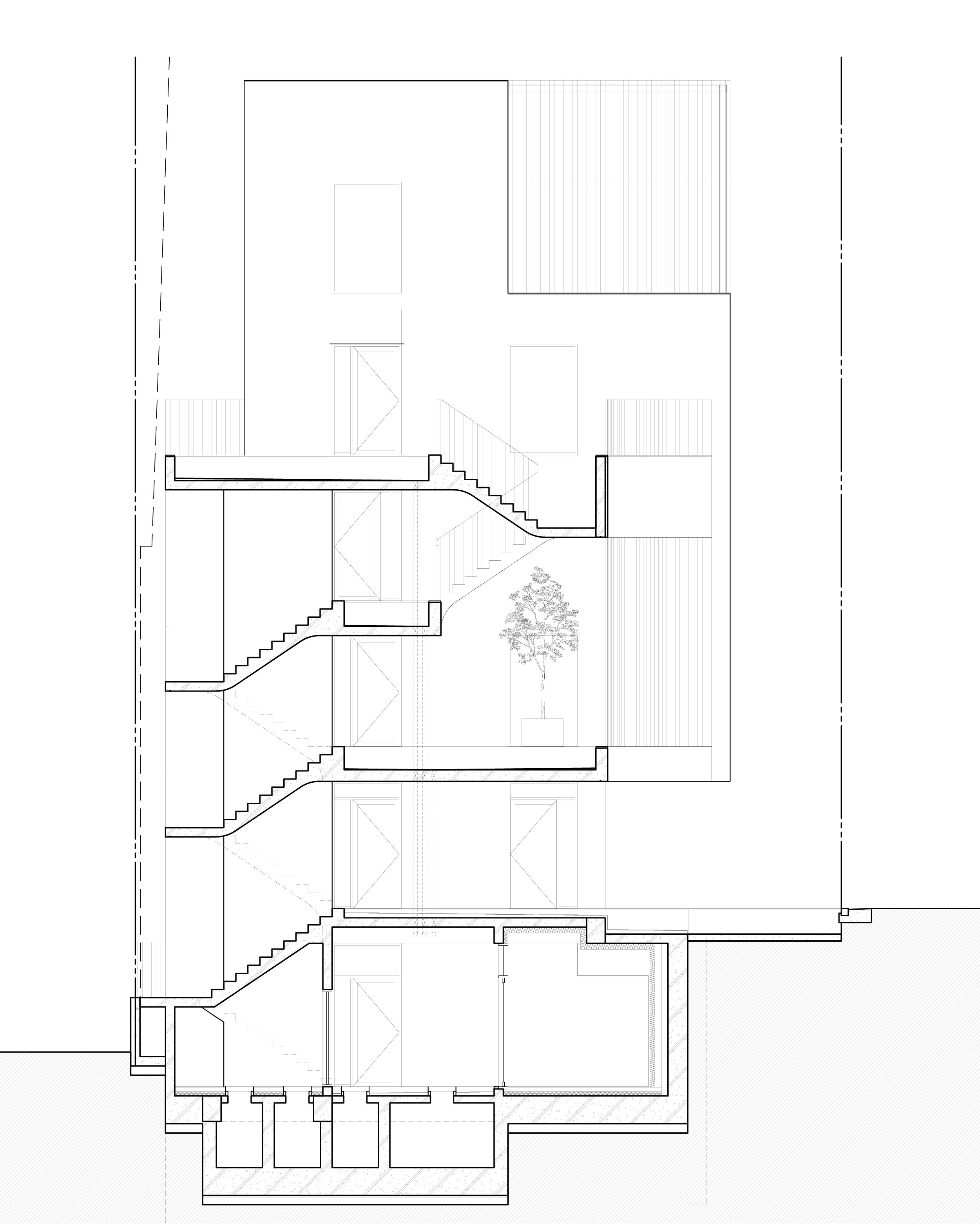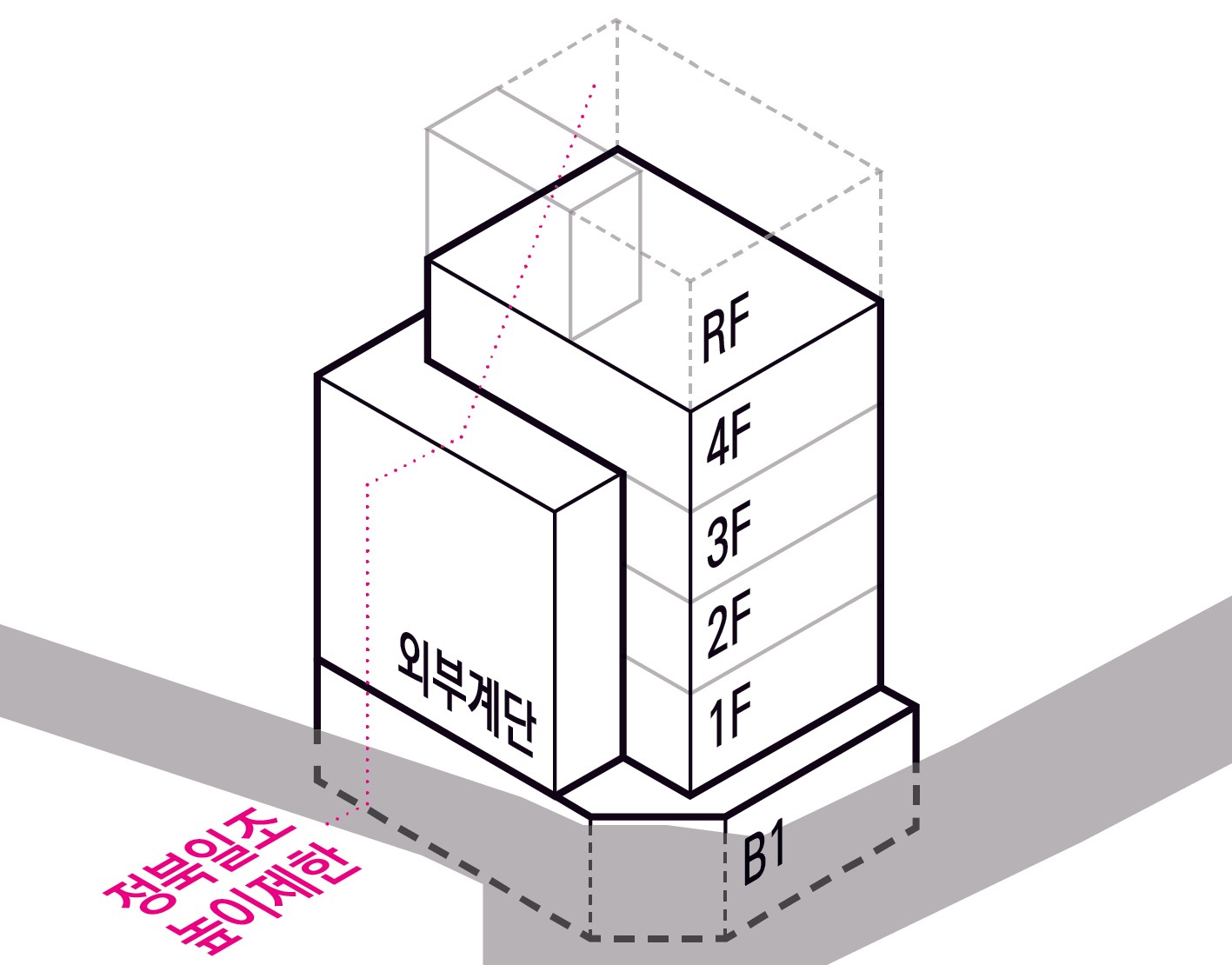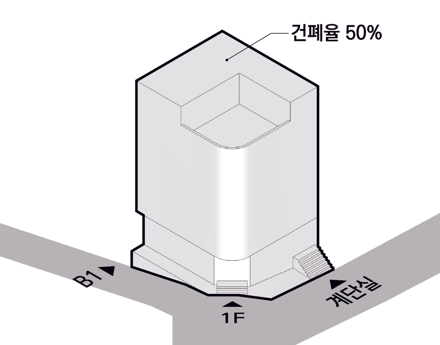 벽∙기둥의 구획이 없는 발코니와 외부계단은 끝에서 1m를 후퇴한 선을 기준으로 바닥면적을 산정한다. 정북일조 높이제한에 대응하고, 공용면적을 최소화하기 위해, 계단을 북측 실외에 계획한다. 지상층은 물론, 지하층의 전용면적도 최대한 확보한다.