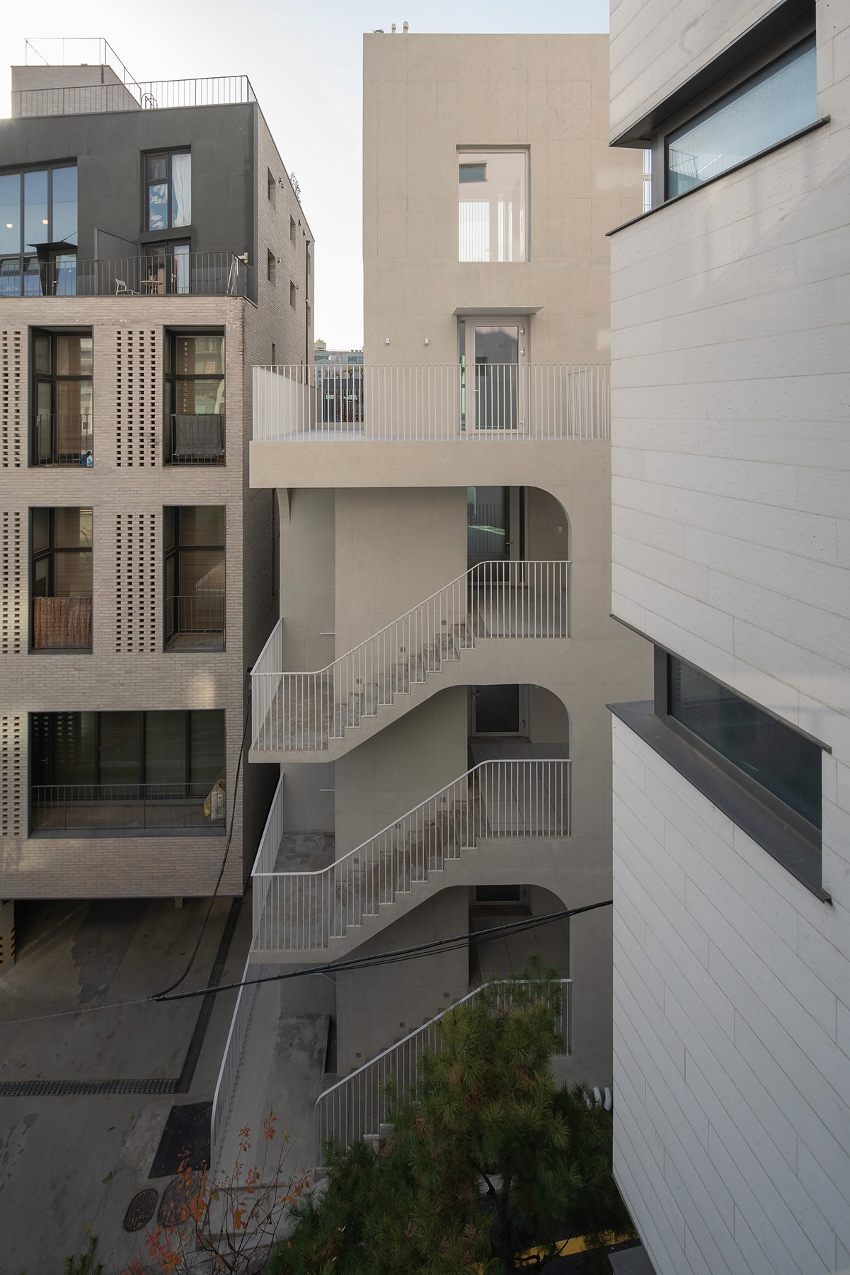 실외에 위치한 계단은 발코니∙테라스∙옥상정원 등과 연속적으로 이어져, 정원 산책로(Promenade Plantée)를 구성한다. 반면에 사람들이 자주 이용하는 엘리베이터는 편의를 고려하여 실내에 배치한다.