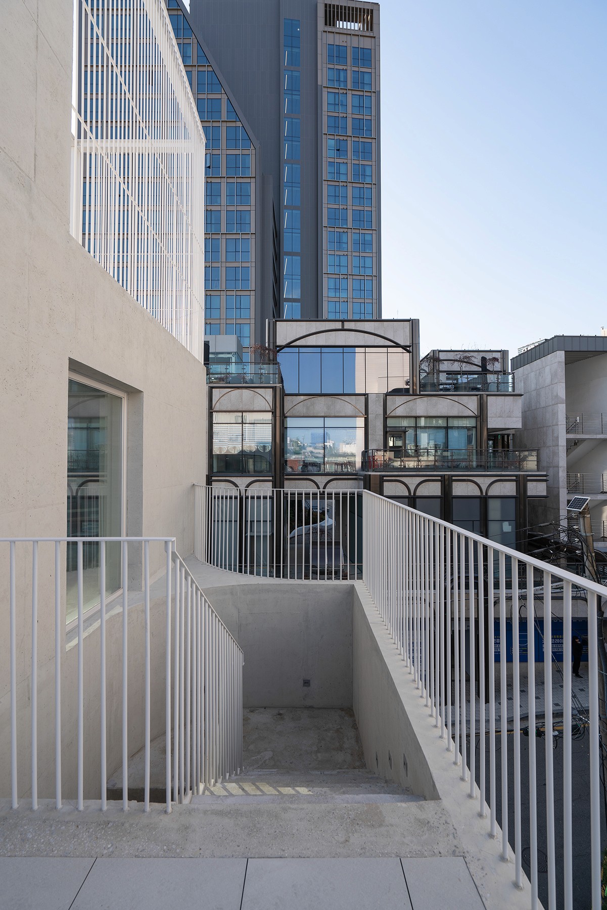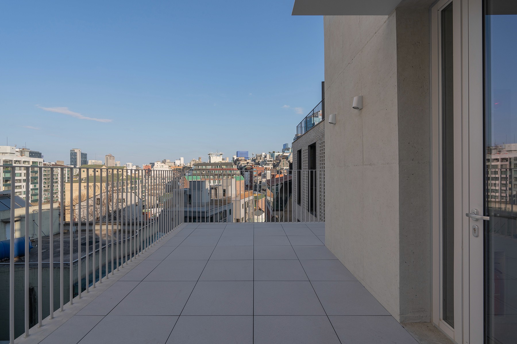 4층의 넓은 테라스에 도착하면, 난간 너머로 도시의 풍경과 하늘이 펼쳐진다.
