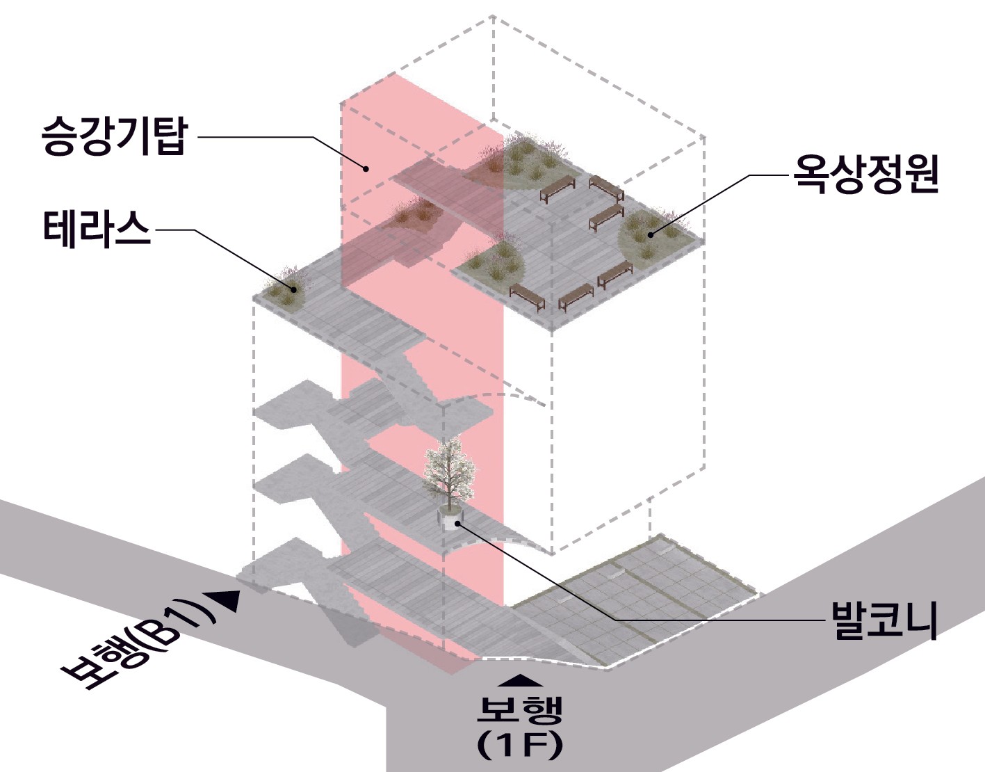 외부계단은 지하1층 선큰에서 지상1층 출입구, 지상2층 발코니, 지상4층 테라스를 거쳐, 옥상정원까지 연결된다. 건물을 이용하는 사람들은 정원 산책로를 따라 걸으며 휴식할 수 있다.
